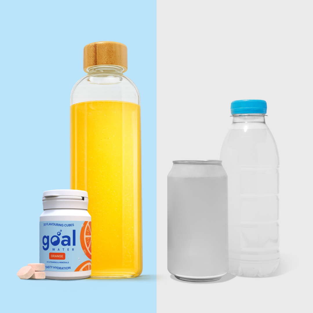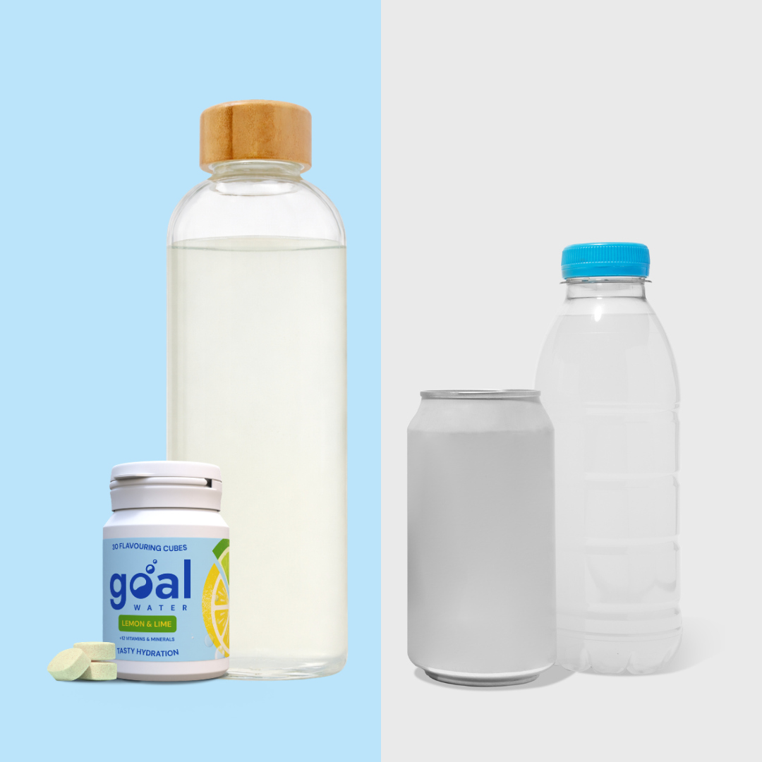 Side by side comparison of GOAL water vs single use plastic bottles and soft drink cans